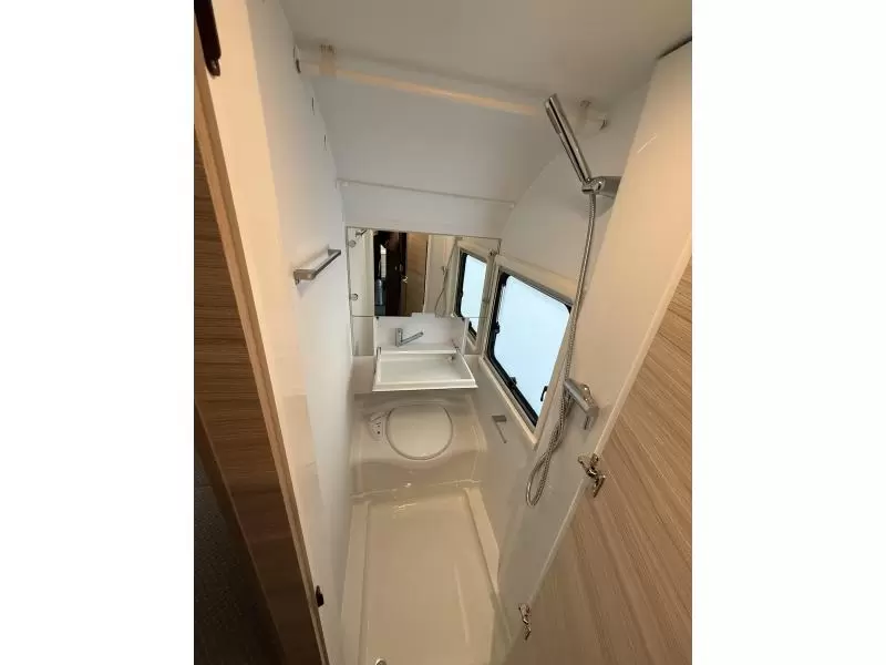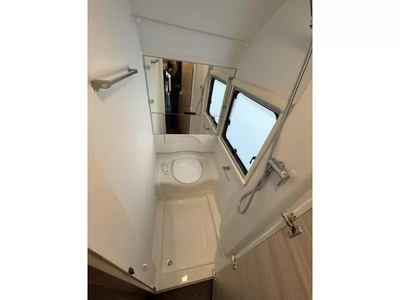 Het dwars geplaatste bed biedt voldoende ruimte voor 2 personen. In de badkamer vindt u niet alleen een wastafel, maar ook een ingebouwd cassettetoilet.