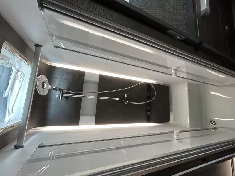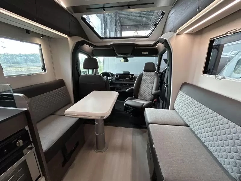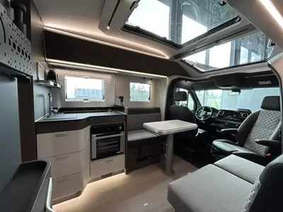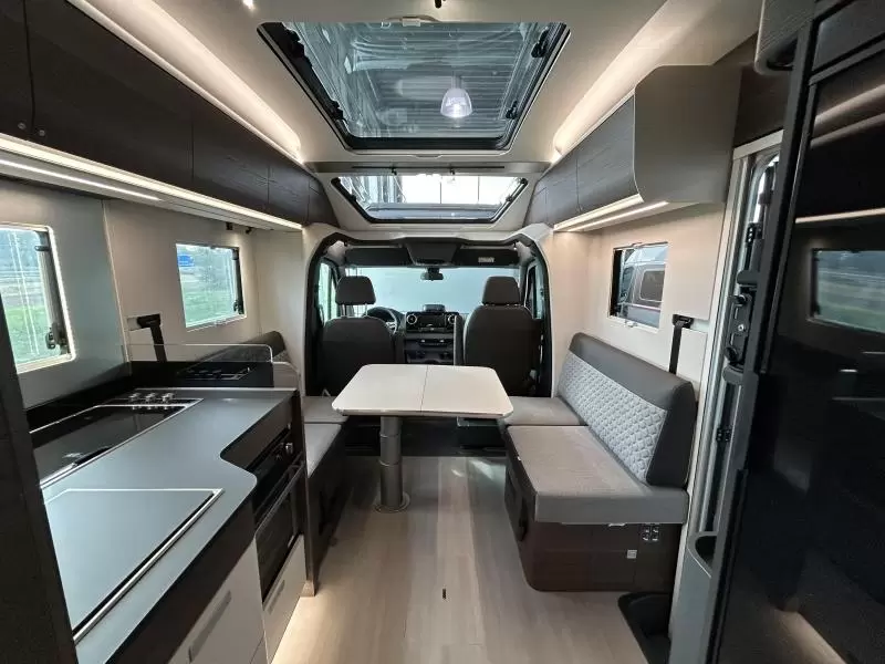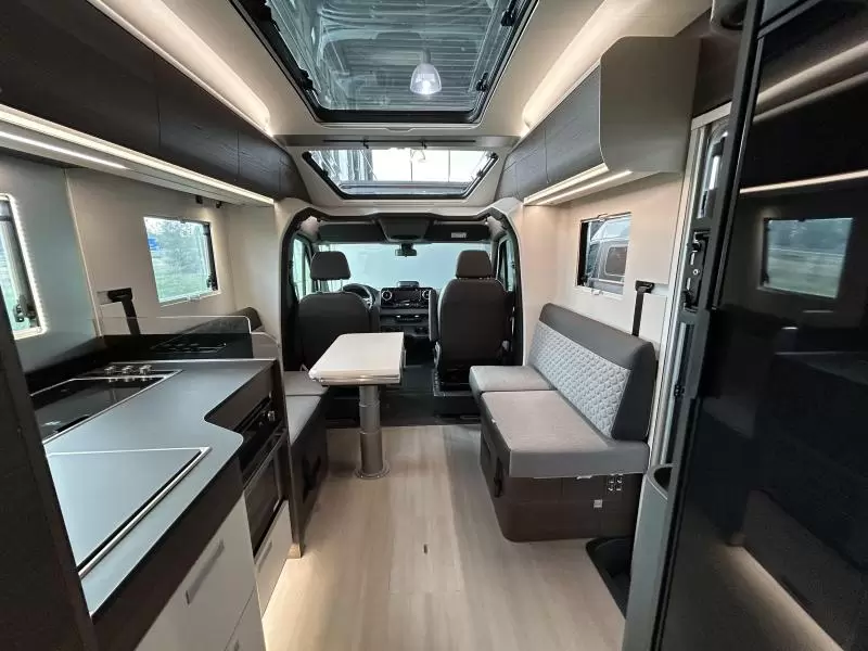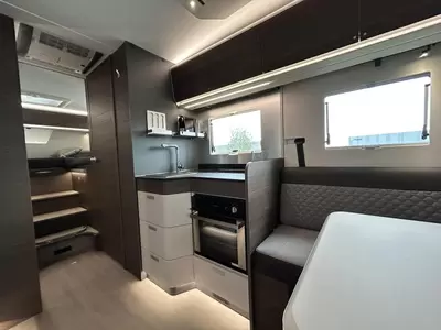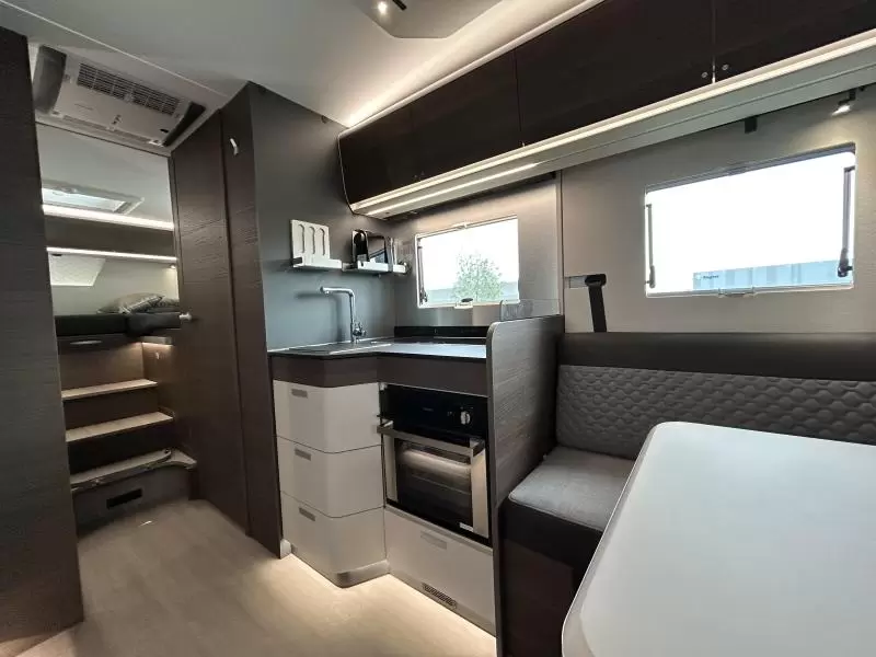 De keuken is in het midden van de camper geplaatst en beschikt over een 3-pits kooktoestel en gootsteen met kraan. Voor een snelle toevoer van warm water is er een boiler aanwezig.