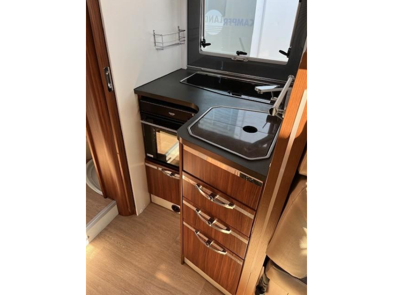 Door de ruime en comfortabele L-zit nodigt de camper uit voor gezellige avonden. Centraal in de camper bevindt zich de middenkeuken, uitgerust met een spoelbak, kraan en 3-pits kooktoestel. Voor een snelle toevoer van warm water is er een boiler aanwezig. De koelkast met vriescompartiment is ruim genoeg voor al uw etenswaren.