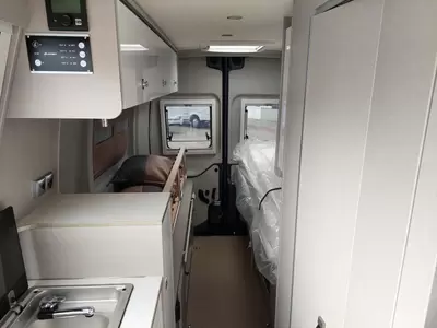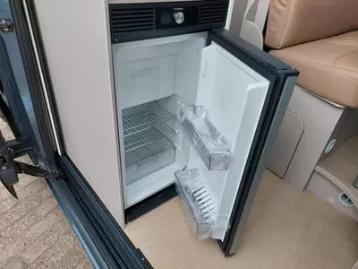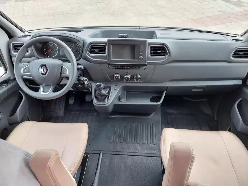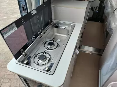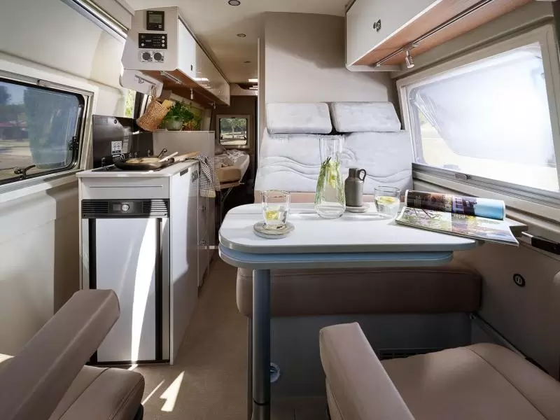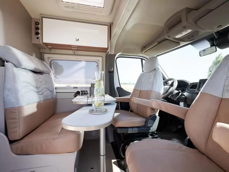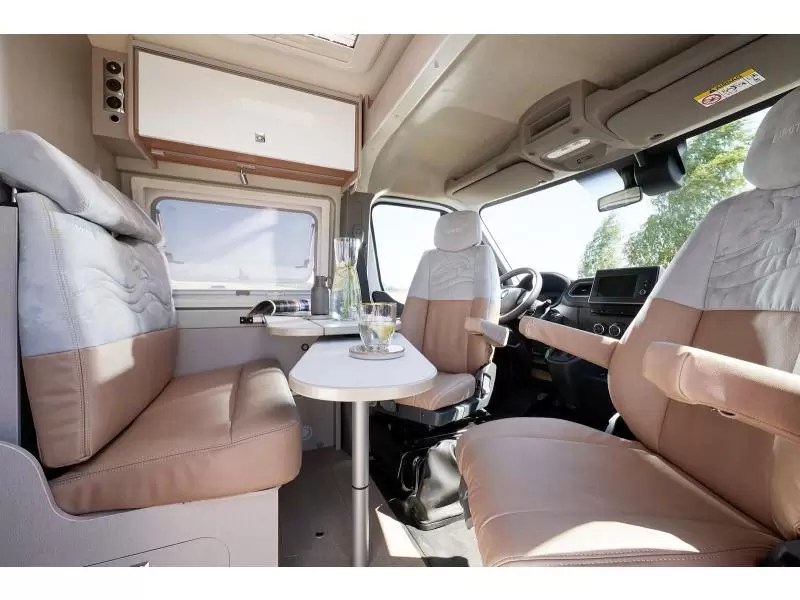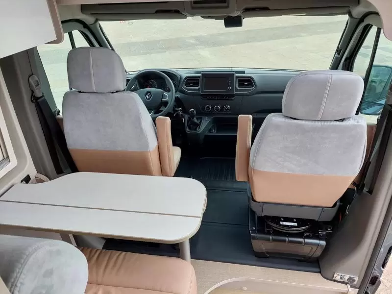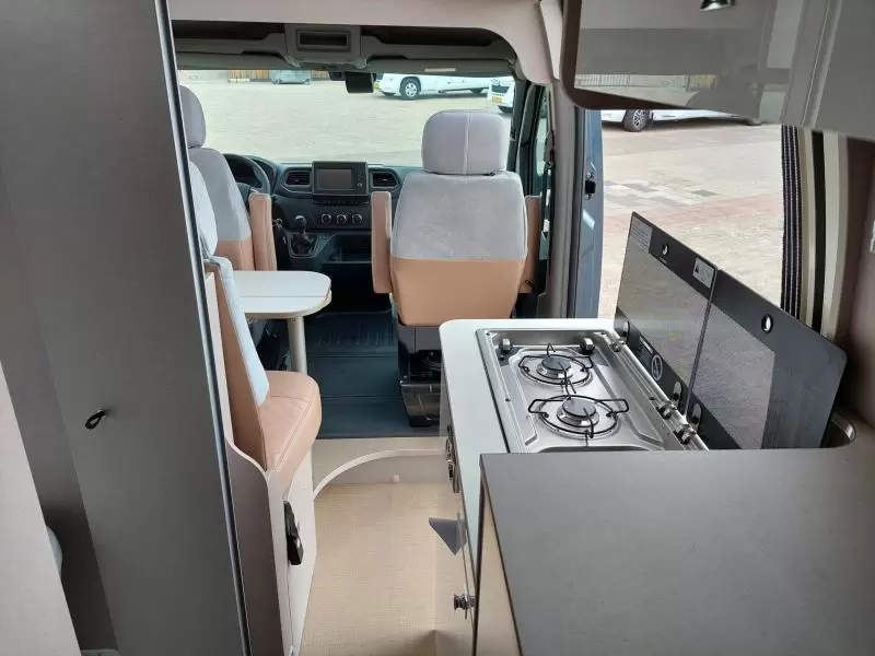 De bestuurders- en passagiersstoel zijn pilotenstoelen, die draaibaar en kantelbaar zijn naar het zitgedeelte. Daarmee creëer je een riante zithoek voorzien van een verstelbare tafel. De camper heeft een keuken met een 2-pits gascomfort en een royale koelkast met een apart diepvriesgedeelte.