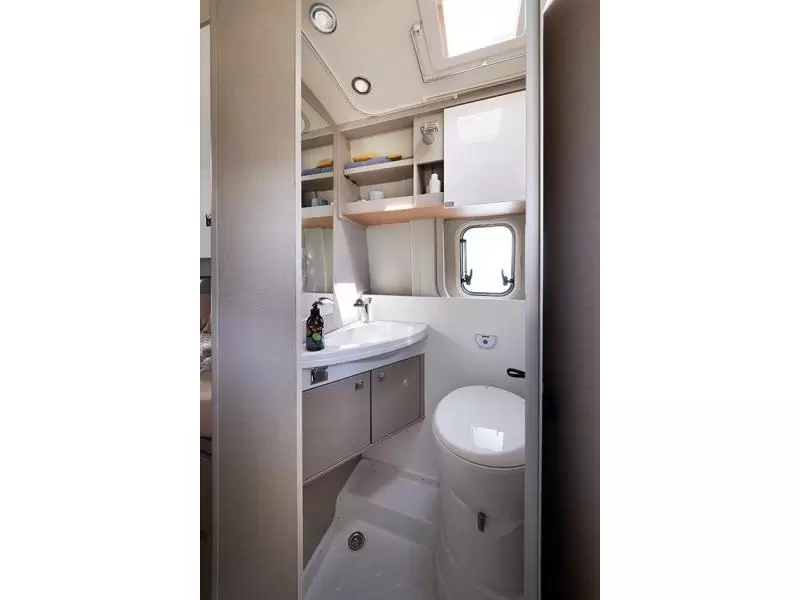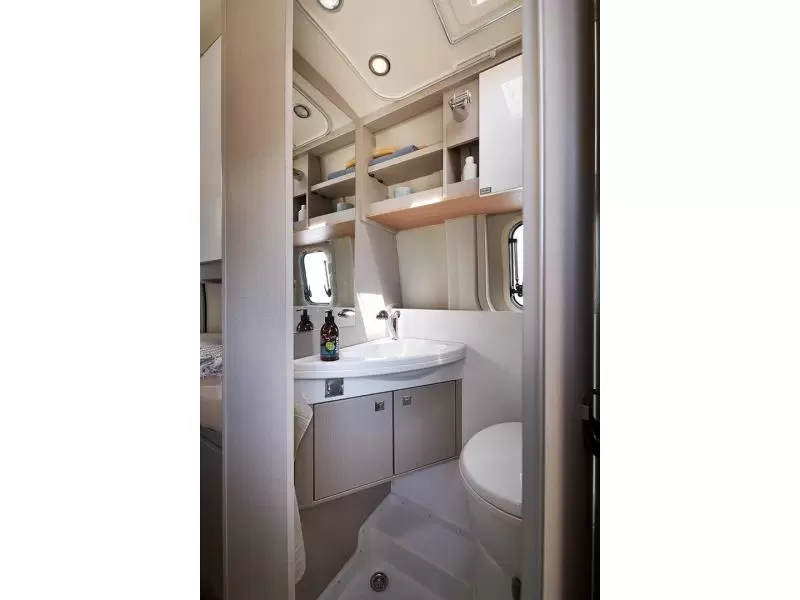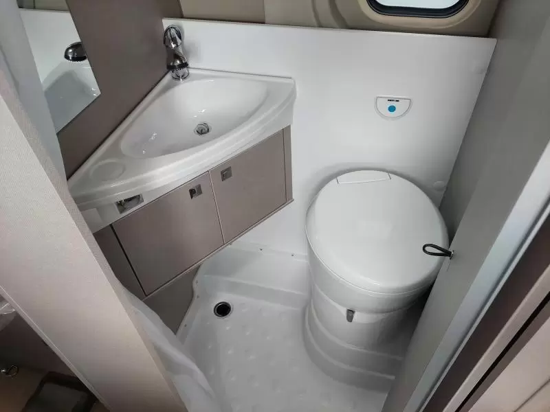 De camper heeft zowel een schoonwater- als vuilwatertank zodat er voldoende water voor het douchen en de afwas is. En een samengevoegde badcel en toiletruimte.
