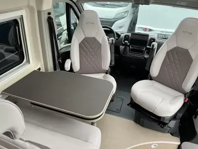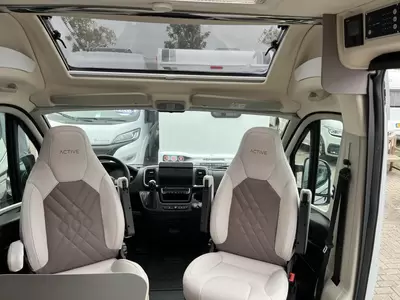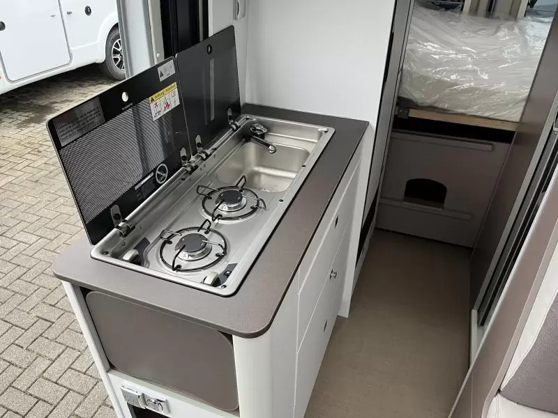 Een gezellige plek om te zitten vindt u in de centrale halve treinzit, deze kan uiteraard ook dienen als extra slaapplaats. Het keukenblok is centraal in de camper gemonteerd en is onder anderen uitgerust met 2-pits gascomfoor, spoelbak en kraan. Voor een snelle toevoer van warm water is er een boiler aanwezig. De ingebouwde koelkast (138 liter) met vriesvak is uitgevoerd in een ruime uitvoering.