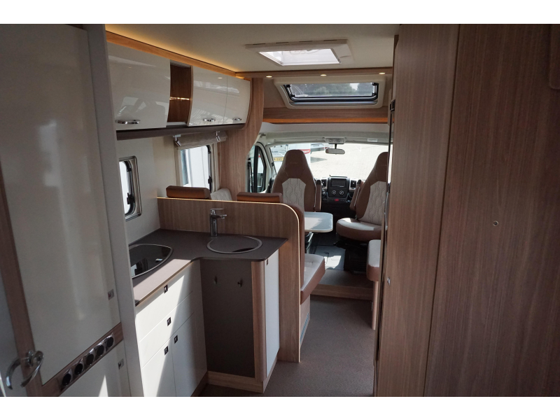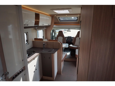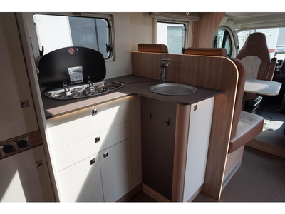 In de praktische, sfeervolle L-zit kunt u gezellig met elkaar eten en drinken. Het keukenblok is centraal in de camper gemonteerd en is onder anderen uitgerust met 3-pits gascomfoor, spoelbak en kraan. De boiler, die in de camper is ingebouwd, voorziet u snel van warm water.