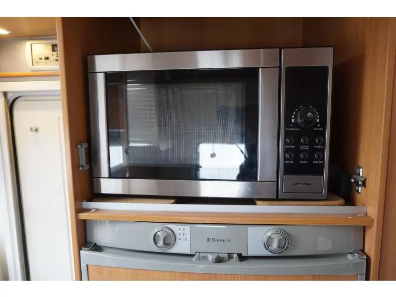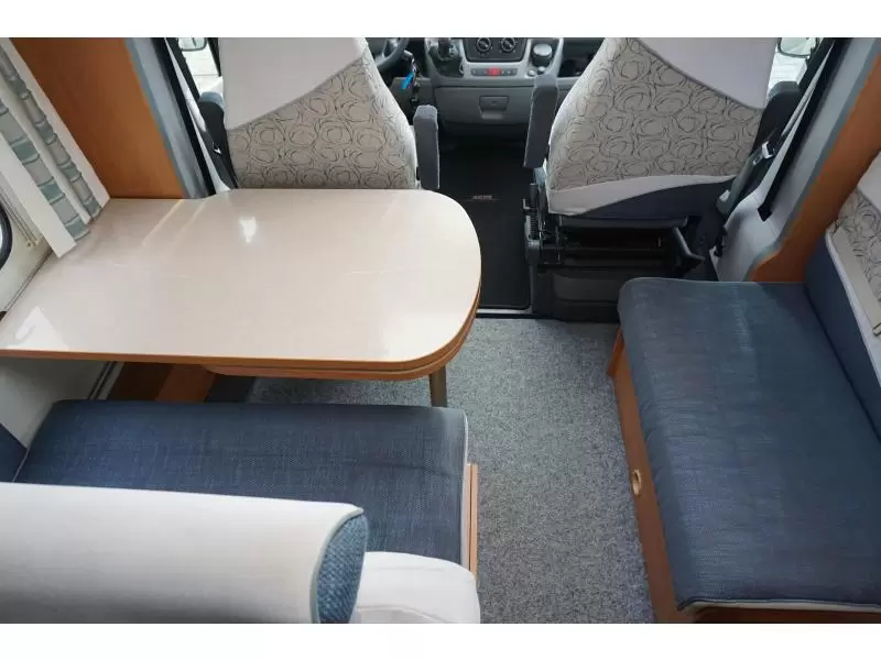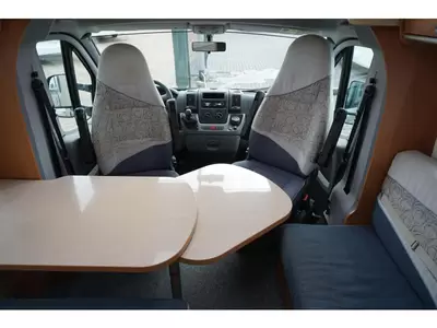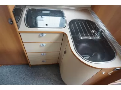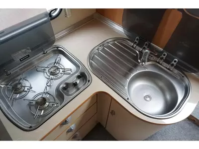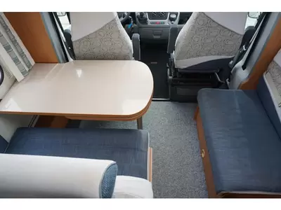 Een gezellige plek om te zitten vindt u in de centrale halve treinzit, deze kan uiteraard ook dienen als extra slaapplaats. De kleine zit, waar de camper ook over beschikt, biedt een heerlijke plaats om even rustig te spelen, te internetten of te drinken. De keuken is in het midden van de camper geplaatst en beschikt over een 3-pits kooktoestel en gootsteen met kraan. Voor een snelle toevoer van warm water is er een 10 liter boiler aanwezig. De koelkast (80 liter) met vriescompartiment is ruim genoeg voor al uw etenswaren. Ook is er een magnetron aanwezig om makkelijk gerechten op te kunnen warmen.