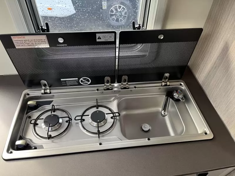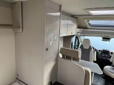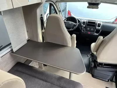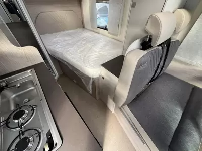Een gezellige plek om te zitten vindt u in de centrale halve treinzit, deze kan uiteraard ook dienen als extra slaapplaats. Het keukenblok is centraal in de camper gemonteerd en is onder anderen uitgerust met 2-pits gascomfoor, spoelbak en kraan. Er is een warmwatervoorziening in de vorm van een boiler aanwezig. De inbouwkoelkast met vriescompartiment heeft een grote inhoud.