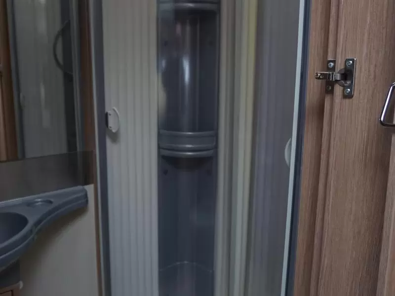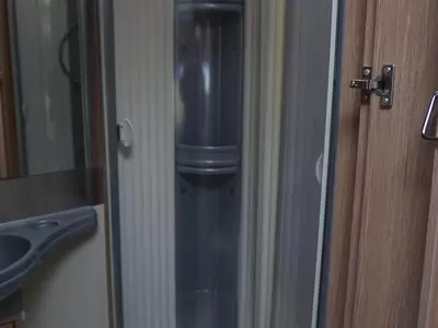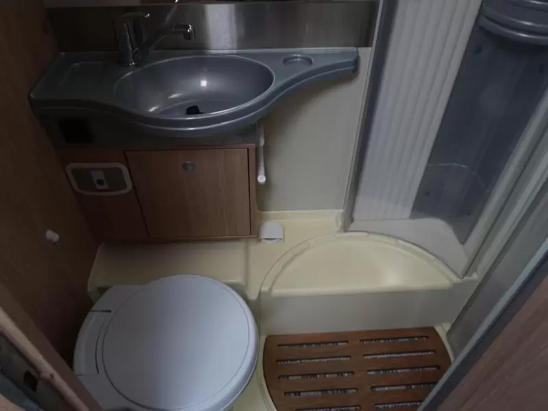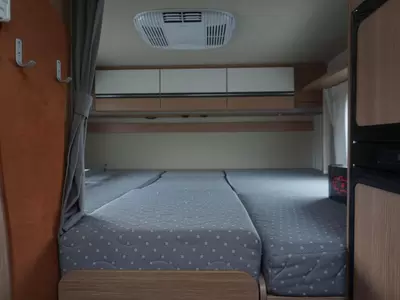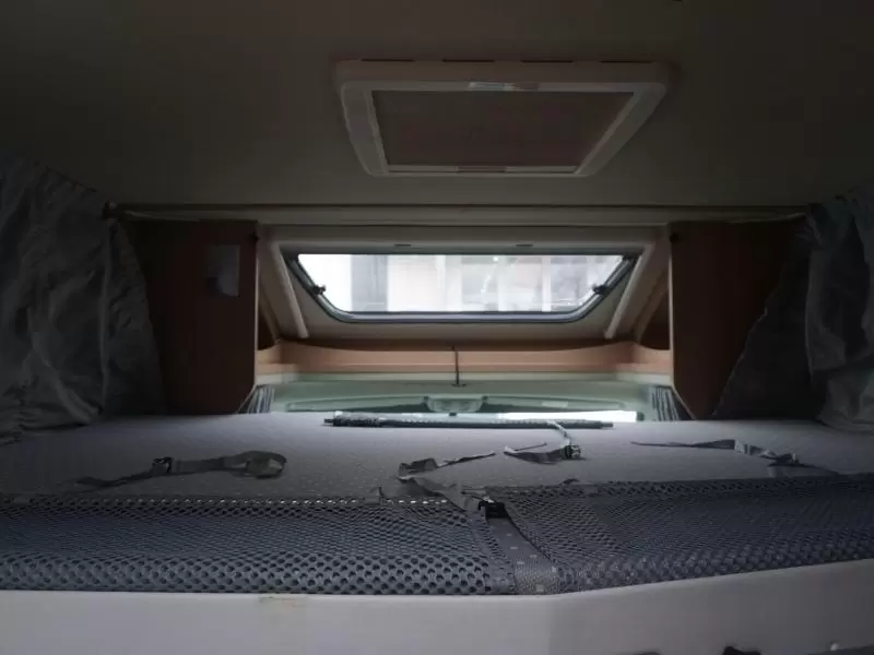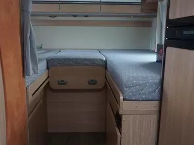 Boven de zitgroep bevindt zich een ruimtebesparend hefbed, waar 2 personen kunnen slapen. De aparte bedden waarmee de camper is uitgerust bieden een ruime slaapplek aan 2 personen. De badkamer biedt wasgelegenheid in de vorm van een wastafel. Tevens is er een ingebouwde cassettetoilet aanwezig. Naast het slaapgedeelte bevindt zich ook de douchegelegenheid.