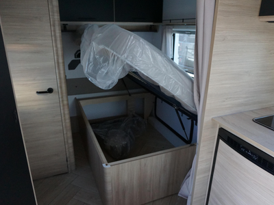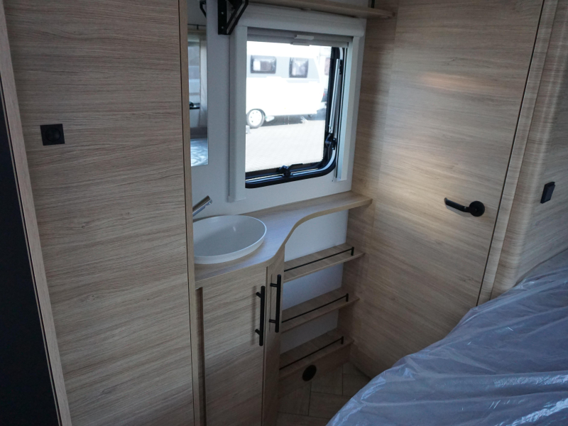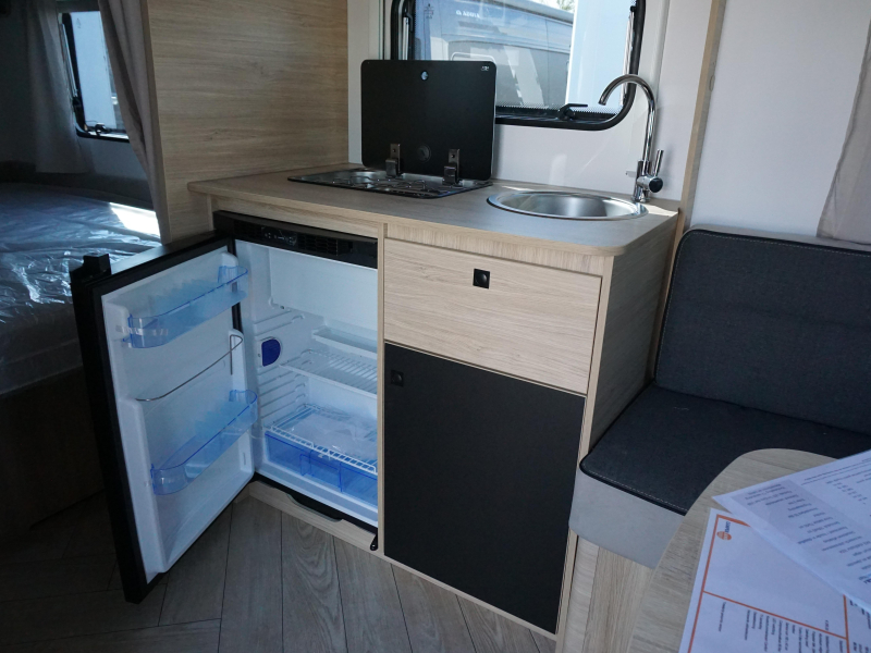 De Sport 455 beschikt over een praktisch ingedeelde binnenruimte met een gezellige rondzit (om te bouwen tot extra slaapplaats), een comfortabel vast bed, en een goed uitgeruste keuken met koelkast en gasfornuis. Dankzij de slimme opbergruimte en de moderne afwerking voelt elke centimeter doordacht aan.