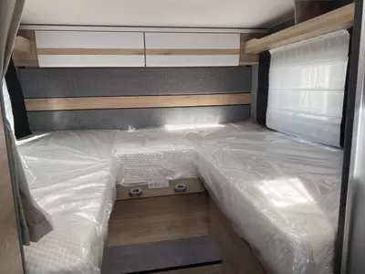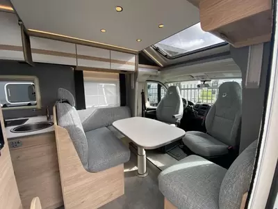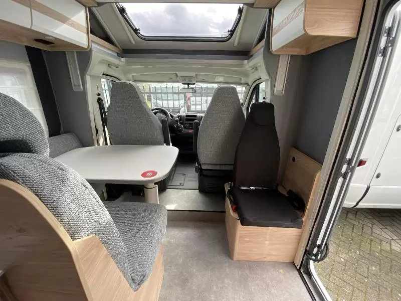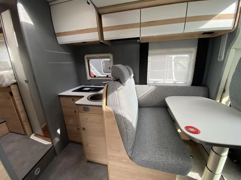 De centraal geplaatste middendinette biedt volop gelegenheid om gezellig samen te zitten. Het keukenblok is centraal in de camper gemonteerd en is onder anderen uitgerust met 3-pits gascomfoor, spoelbak en kraan. Een ingebouwde boiler voorziet je van warm water. Om jouw etenswaren op te bergen is er een koelkast met vriescompartiment ingebouwd.