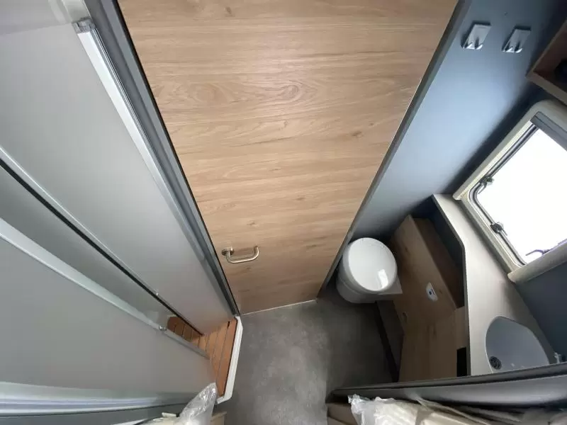 Van vliegen en andere insecten heb je in deze camper, dankzij de hordeur, geen last. De afwerking van deze volwaardige camper wordt verder mede bepaald door de vaste afvalwatertank, de buitenlamp en de lichtmetalen velgen.
