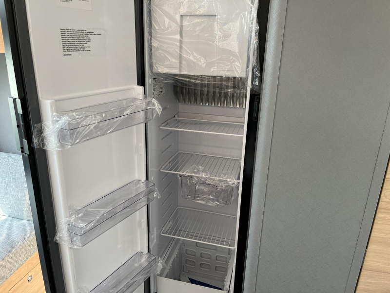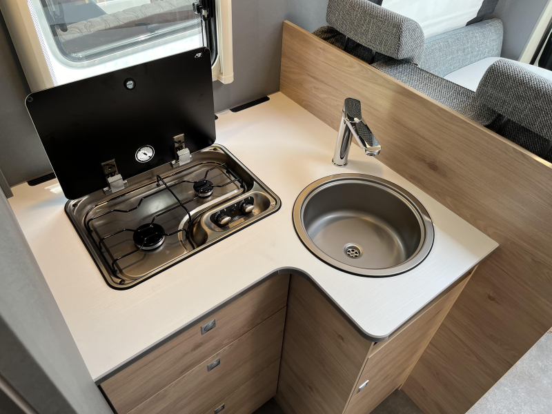 De uitnodigende L-zit is een prima plek om gezellig te eten en te drinken. De keuken is in het midden van de camper gemonteerd en beschikt onder meer over een 3-pits kooktoestel en gootsteen met kraan. De boiler, die in de camper is ingebouwd, voorziet snel van warm water. Om jouw etenswaren op te bergen is er een koelkast met vriescompartiment ingebouwd.