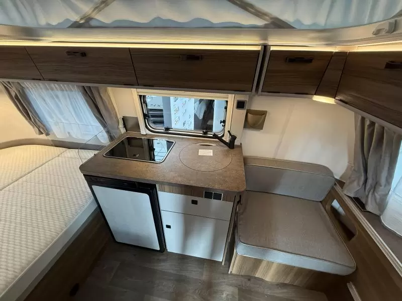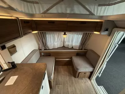 De kleine zit, waar de caravan ook over beschikt, biedt een heerlijke plaats om even rustig te spelen, te internetten of te drinken. Het keukenblok is centraal in de caravan geplaatst. De boiler, die in de caravan is ingebouwd, voorziet u snel van warm water. De inbouwkoelkast met vriescompartiment heeft een grote inhoud.