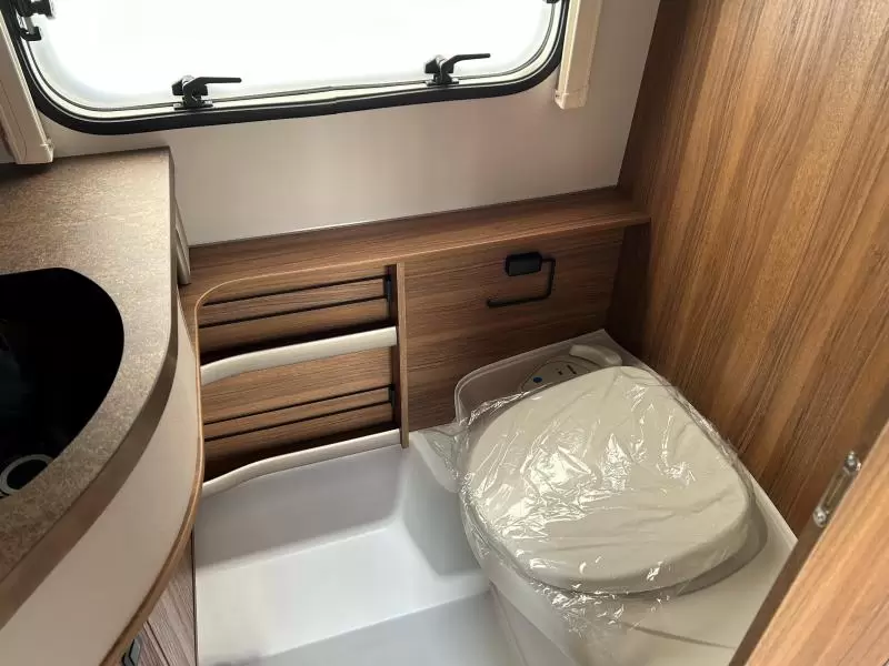 Het royale tweepersoons bed is dwars in de caravan geplaatst. De badkamer biedt gelegenheid om u aan de wastafel op te frissen en er is tevens een cassettetoilet.