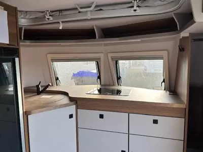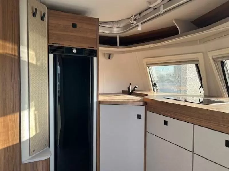 De keuken is aan de voorzijde van de caravan geplaatst. Voor een snelle toevoer van warm water is er een boiler aanwezig. De ingebouwde koelkast met vriesvak is uitgevoerd in een ruime uitvoering.