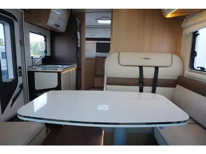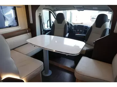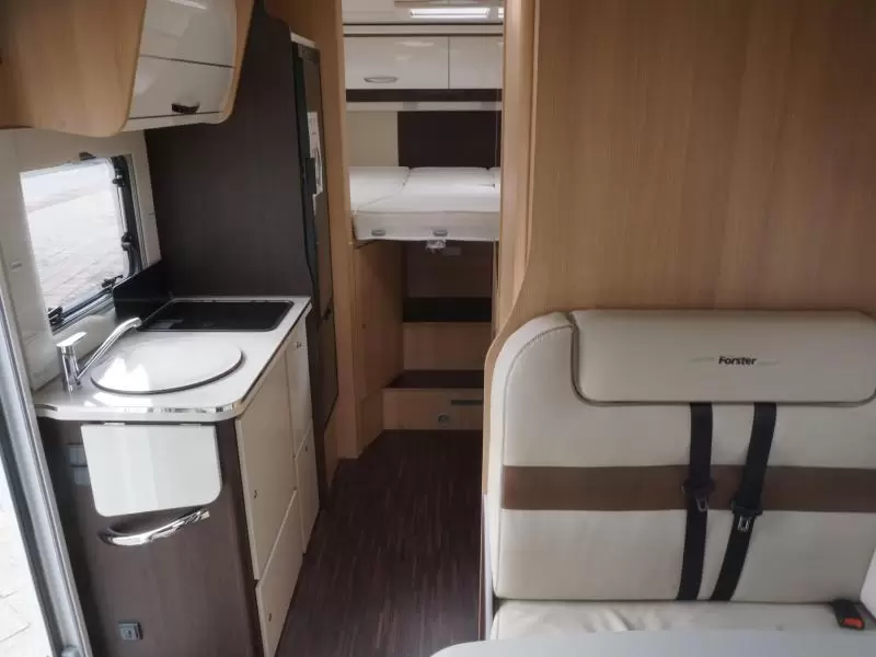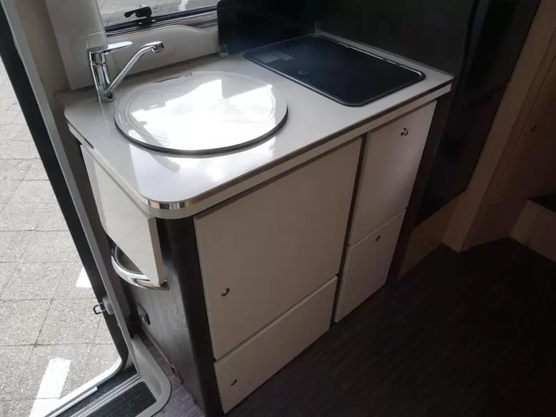 De camper is voorzien van een handige L-zit voor een sfeervol samenzijn. Het keukenblok is centraal in de camper geplaatst. Er is een warmwatervoorziening in de vorm van een boiler aanwezig. Om uw etenswaren op te bergen is er een koelkast met vriescompartiment ingebouwd.