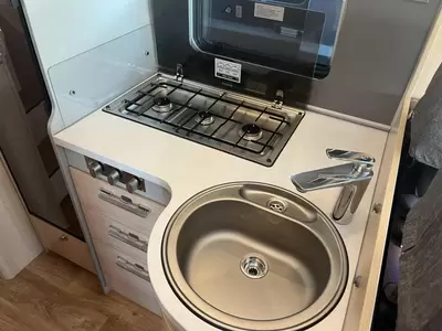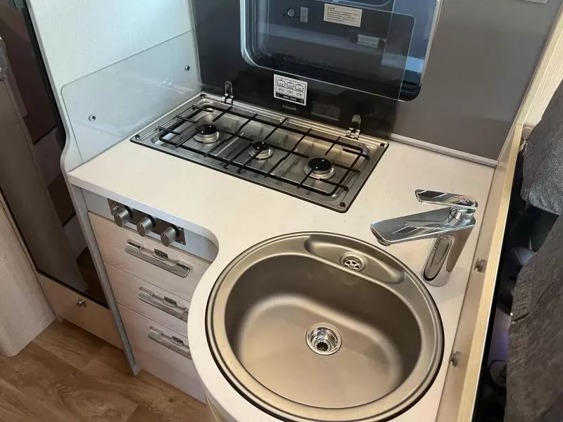 Door de ruime en comfortabele L-zit nodigt de camper uit voor gezellige avonden. Het keukenblok is centraal in de camper geplaatst. Er is een boiler aanwezig, die u van warm water voorziet. De koelkast met vriescompartiment is ruim genoeg voor al uw etenswaren.