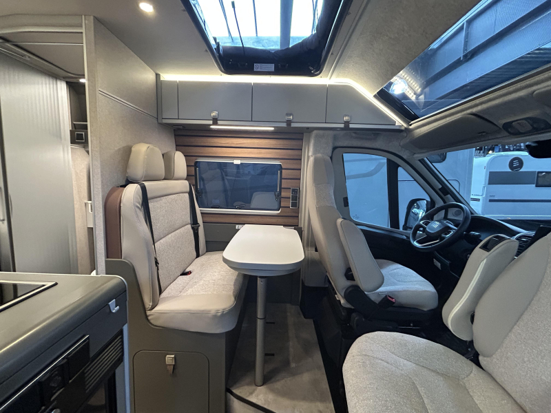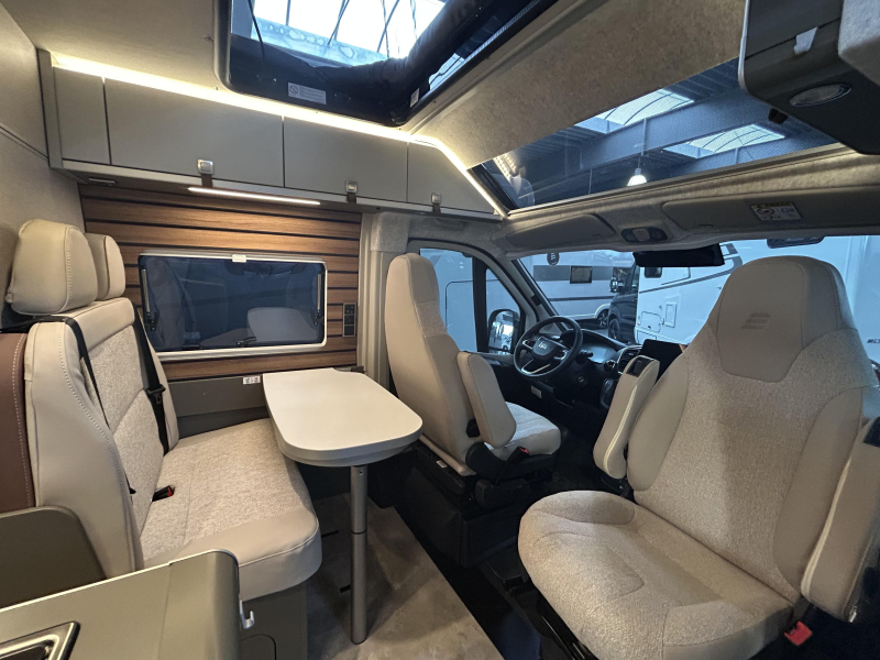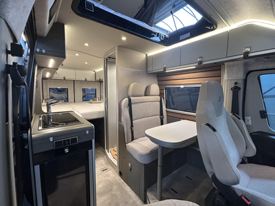 Deze complete kampeerwagen is van het merk Hymer. Ook tijdens somber weer is er in de camper voldoende daglicht omdat deze een groot panoramadak heeft.