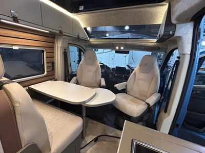 Deze complete kampeerwagen is van het merk Hymer. Ook tijdens somber weer is er in de camper voldoende daglicht omdat deze een groot panoramadak heeft. Het onderstel is van het merk Fiat. De dieselmotor wordt bediend met een automatische versnelling....