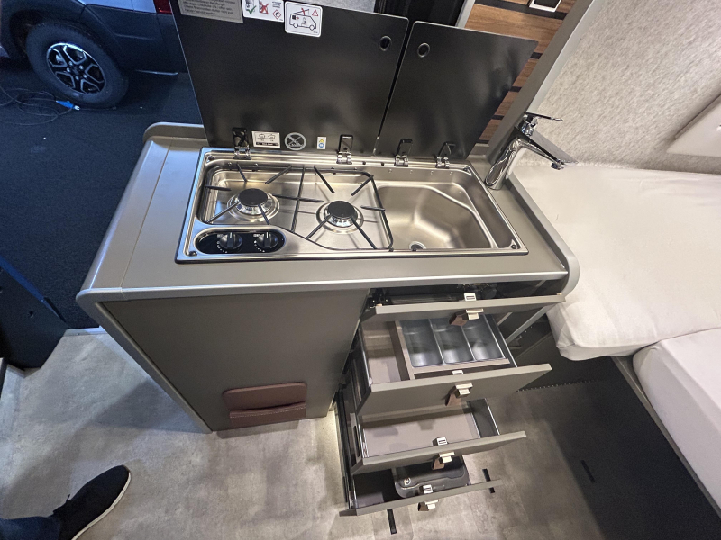 Het unieke van deze maar 6 meter camper is dat hij 2 lengte bedden heeft, waarvan 1 van 202cm lang.