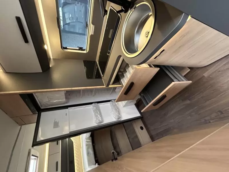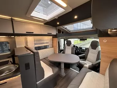 De camper is uitgerust met een kleine zit. Dit zitje kan ook tot slaapplaats worden omgebouwd. In de praktische, sfeervolle L-zit kunt u gezellig met elkaar eten en drinken. Het keukenblok is centraal in de camper gemonteerd en is onder anderen uitgerust met 3-pits gascomfoor, spoelbak en kraan. Voor een snelle toevoer van warm water is er een boiler aanwezig. Om uw etenswaren op te bergen is er een koelkast (142 liter) met vriescompartiment ingebouwd.