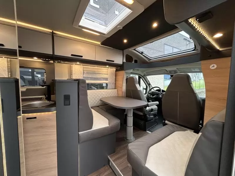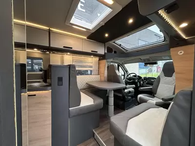 Knaus L!VE TI 700 MEG Platinum Selection Model 2026Deze camperbeschikt over twee aparte eenpersoonsbedden achterin, een ruime middenkeuken en -badkamer, en een zitgroep.