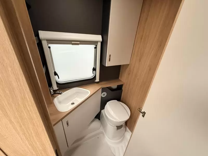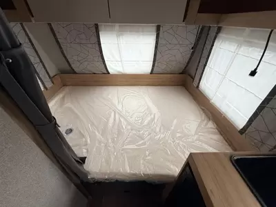 Het royale tweepersoons bed is dwars in de caravan geplaatst. Deze caravan beschikt over een badkamer. Hierin bevindt zich een wastafel en ingebouwd cassettetoilet.