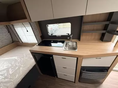 Een extra slaapgelegenheid wordt gevormd door de comfortabele, gezellige treinzit. De keuken is in het midden van de caravan geplaatst. Er is voldoende bergruimte, uiteraard zijn er ook een 3-pits kooktoestel en gootsteen met kraan aanwezig. Er is een boiler aanwezig, die u van warm water voorziet. De koelkast met vriesvak biedt voldoende ruimte voor heel uw voorraad.