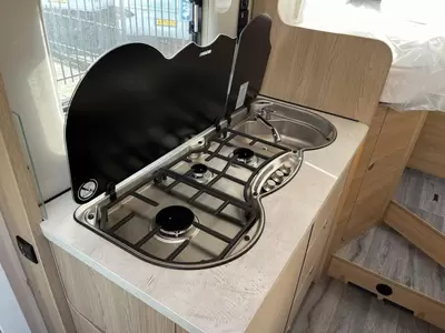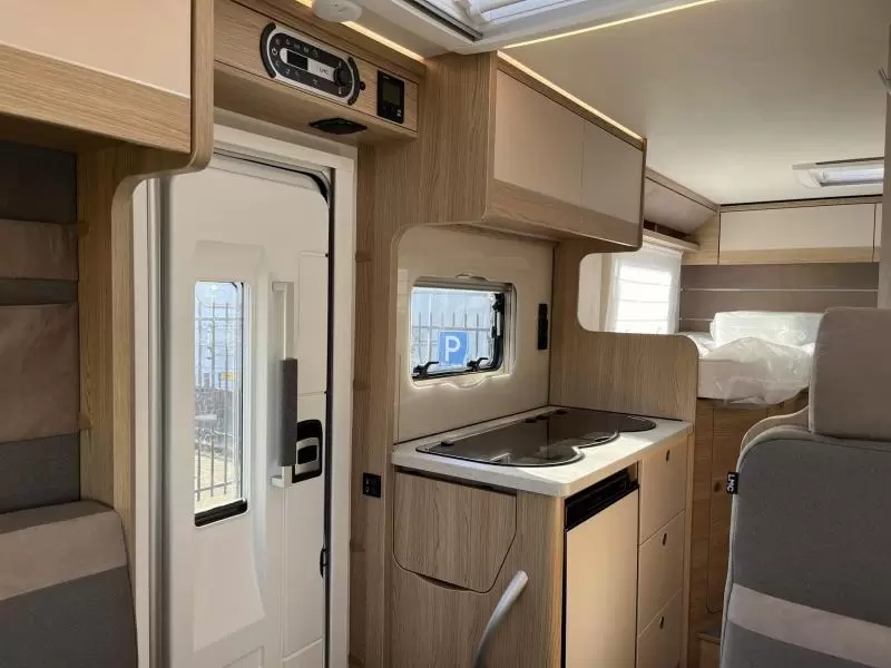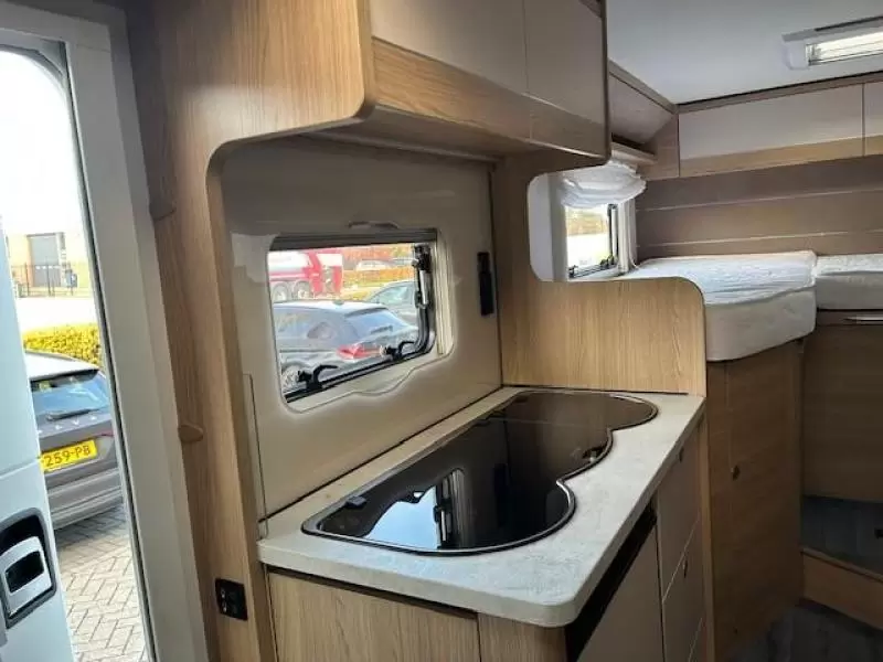 De camper is voorzien van een handige L-zit voor een sfeervol samenzijn. Centraal in de camper bevindt zich de middenkeuken, uitgerust met een spoelbak, kraan en 3-pits kooktoestel. Voor een snelle toevoer van warm water is er een boiler aanwezig. De koelkast met vriescompartiment is ruim genoeg voor al uw etenswaren.