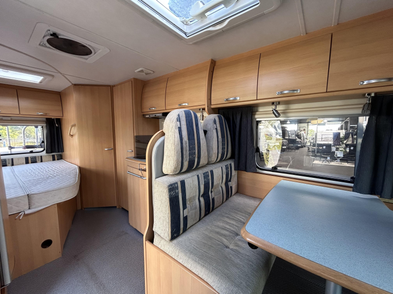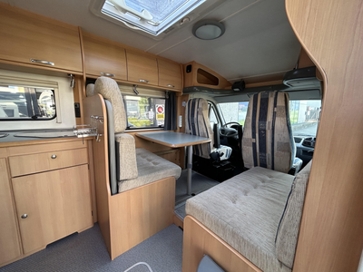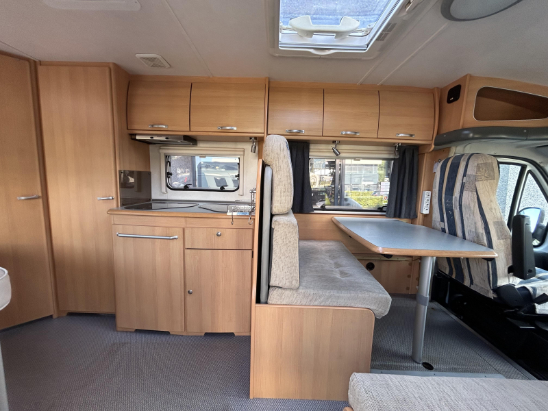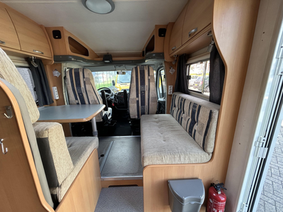 De camper beschikt over een treinzit, om aan het einde van de dag samen ontspannend te eten en te drinken. De complete keuken is in het midden van de camper geplaatst. Voor een snelle toevoer van warm water is er een boiler aanwezig. De koelkast met vriescompartiment is ruim genoeg voor al uw etenswaren.