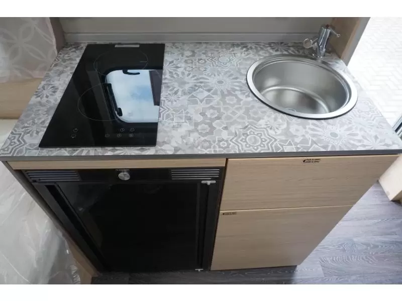 De treinzit vormt niet alleen een gezellige plek om te zitten, maar is ook een extra slaapgelegenheid. De keuken is in het midden van de caravan gemonteerd.
