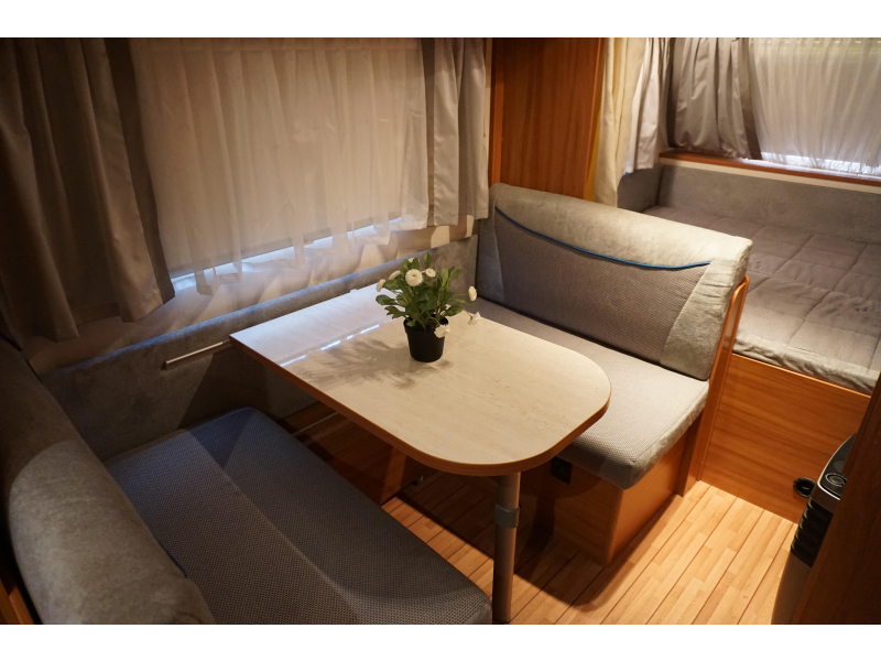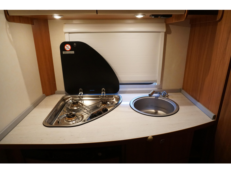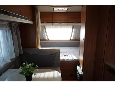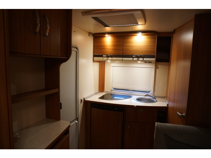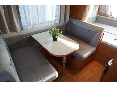 Om met zijn allen gezellig te kunnen eten en drinken beschikt de caravan over een centraal geplaatste middendinette. Achterin de caravan bevindt zich de keuken, die uiteraard is voorzien van een kraan, gootsteen en een 3-pits kooktoestel. Er is een 5 liter boiler aanwezig, die u van warm water voorziet. Om uw etenswaren op te bergen is er een koelkast met vriescompartiment ingebouwd.