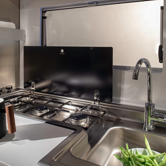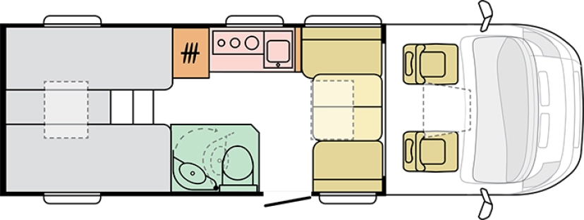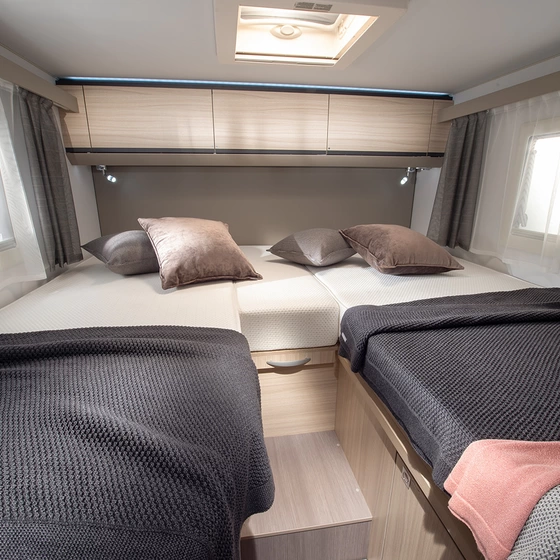 Veel leefruimte in een compacte camper, dankzij een modern open interieur. De salon is ruimtelijk en voorzien van een verlengbare dinette tafel. Het grote panoramavenster zorgt voor een atrium-stijl beleving.