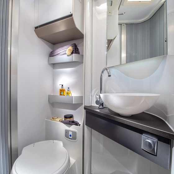 Het ontwerp van de douche- en toiletruimte benut de ruimte optimaal. Zowel voor de basisuitrusting als voor opbergruimte en luxe extra’s. Zo is de badkamer voorzien van een innovatieve draaiwand en een kledingrail.
