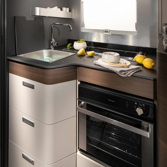 Een grote slim tower koelkast, drie pits gasfornuis, solide werkblad en geintegreerde spoelbak. Het zijn maar een paar voorbeelden van de luxe standaarduitrusting. Modelafhankelijk is zelfs een gasoven mogelijk.