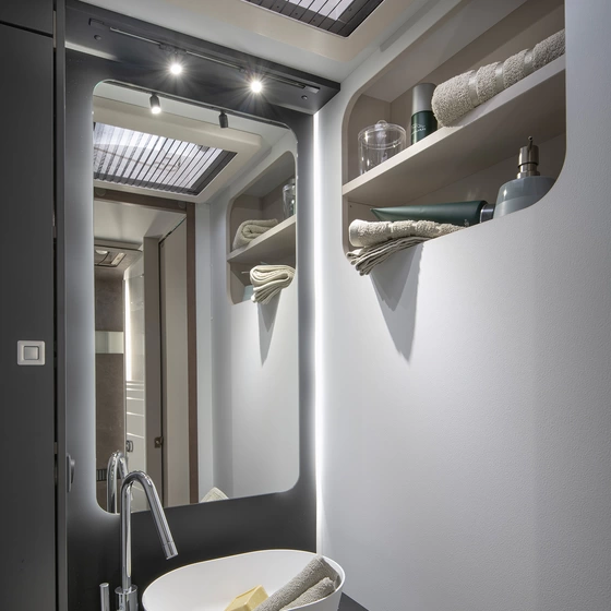 Het ontwerp van de badkamer benut de ruimte optimaal. Naast de standaarduitrusting zijn de douche- en toiletruimtes voorzien van een elegante douchewand en geintegreerde opbergruimtes voor al je persoonlijke spullen.