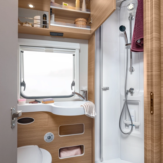 Ultiem comfort is onderweg je eigen badkamer hebben. Hem overal mee naar toe kunnen nemen is een ware luxe. Modelafhankelijk zijn er verschillende badkamerindelingen mogelijk in de Knaus L!ve I.