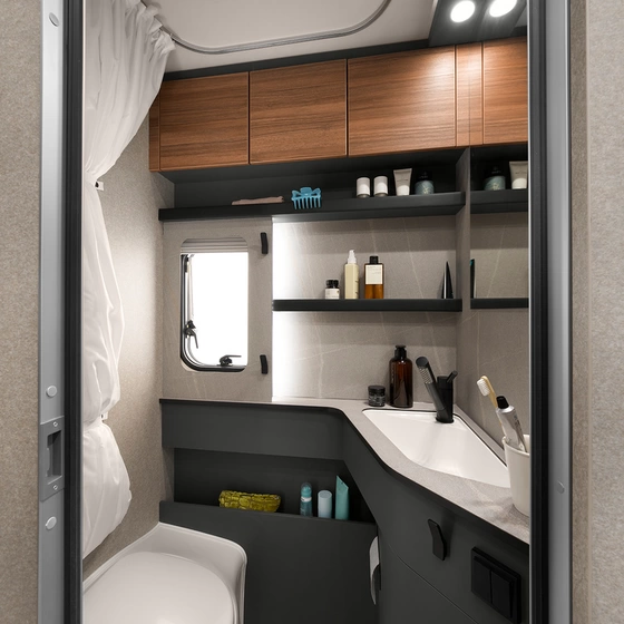 Wie zegt dat een compacte badkamer niet comfortabel kan zijn? De Eriba Novaline bewijst het tegendeel! De uitgebreide uitrusting van de douche- en toiletruimte benut de ruimte optimaal en kent slimme opbergmogelijkheden.