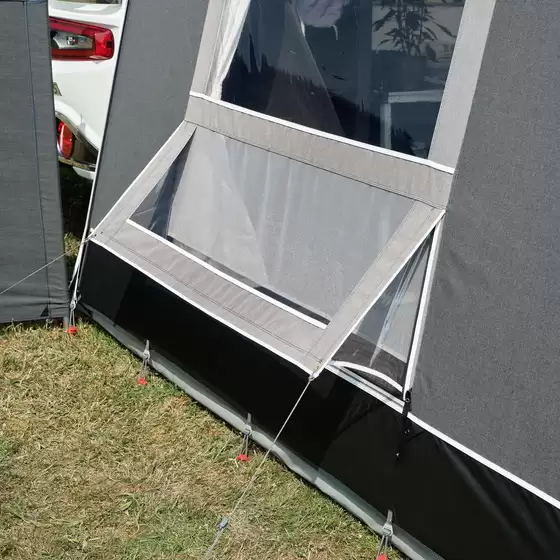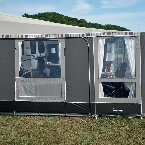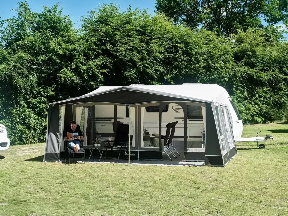 Een populaire favoriet van seizoenskampeerders: de Isabella Forum Etna. Dit model Isabella voortent is flexibel in te delen door zijn verplaatsbare fronten. Je kunt bijvoorbeeld kiezen voor een hele ruime voortent, of het front naar achter plaatsen voor een overdekt terras. De voortent heeft een diepte van 350 cm en past op vrijwel alle caravanformaten.